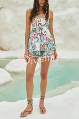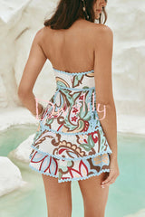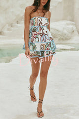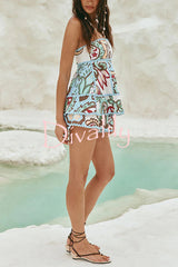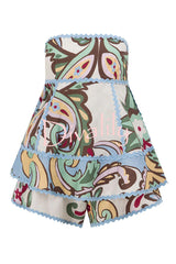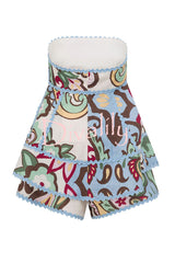 Unique botanical print serrated trim sleeveless off shoulder top and elastic waist casual shorts set