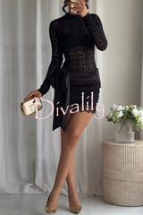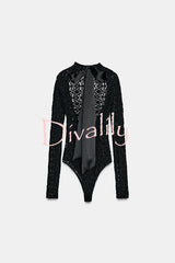 - Semi-sheer bodysuit in soft lace fabric. Featuring an adjustable round neckline with a matching satin tie and long sleeves. Snap-button fastening at the bottom.Our distinctive clothing will add instant style to your wardrobe .