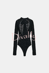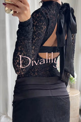 Anna semi-sheer lace long sleeve back bow tie-up cutout stretch bodysuit