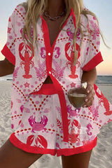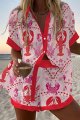 Lobster and crab print loose button elastic waist shorts set