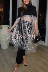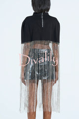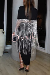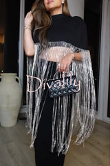 - The New Level Shiny Fringe Cropped Cape is a dramatic cape-style shirt. It features a stand-up collar, a stretch-knit hem, faux front pockets, and extra-long rhinestone fringe detailing. The cuffs are rounded for a draped look. Wear it with a knit midi dress and knee-high boots.Our distinctive clothing will add instant style to your wardrobe..