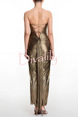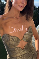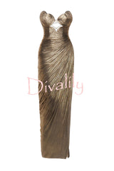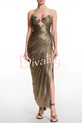 Amisha metallic pleated shell cups hollow gold pendant strapless drape slit maxi dress