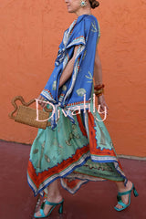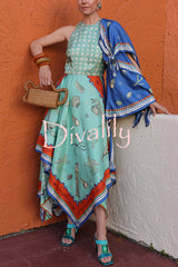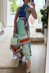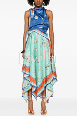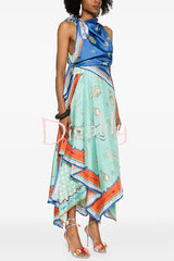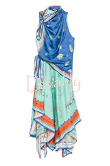 Surrealist summer satin unique print tie-up details layered hem scarf maxi dress