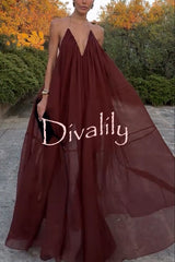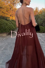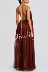 Flowing lightweight chiffon chain halter neck detail backless a-line maxi dress