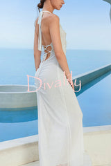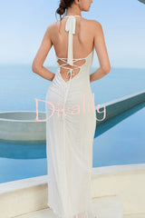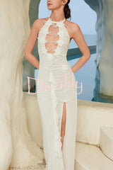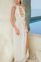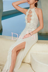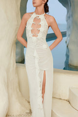 Solid color hollowed-out halter neck tie slim fit ruffled cover-up maxi dress