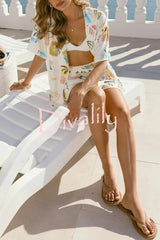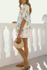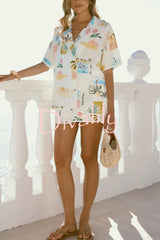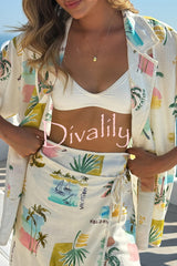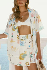 Resort-print loose-fitting lapel short-sleeved shirt and casual tie mini skirt set