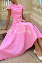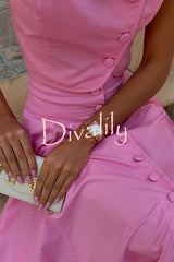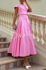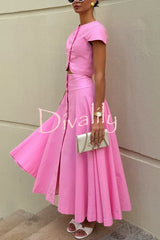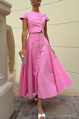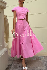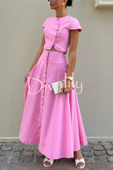 Solid color round neck button crop top and elegant high waist slit maxi skirt set