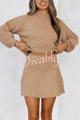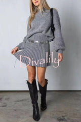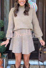 Solid color round neck puff sleeve loose knit sweater and casual striped mini skirt set