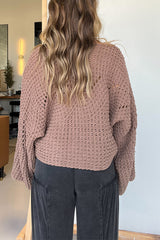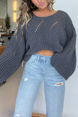 Solid color hollow loose round neck bat sleeve knitted sweater