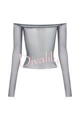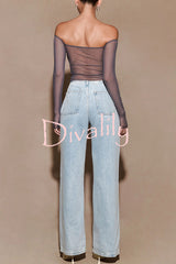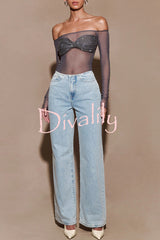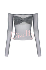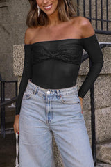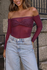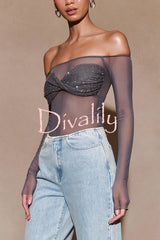 - Designed with a bardot neckline and long sleeves, this top showcases an alluring off-shoulder style that highlights your collarbone. The mesh fabrication gives it a modern, sultry look, while the diamante-encrusted bust adds a touch of sparkle and luxury. A twist front detail enhances its unique style, making this top perfect for elevating your evening look with effortless sophistication.