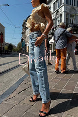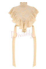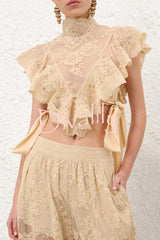 Salenia lace appliqué high neck side tie-up ruffle cropped top