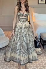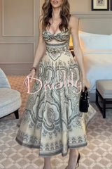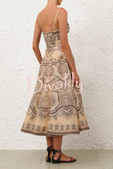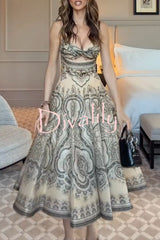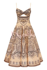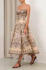 Luna linen blend paisley print twist back smocked pocket slip midi dress