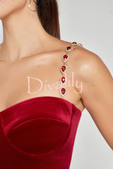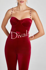 • The Eliza jumpsuit is crafted from luxurious velvet and features a bustier-style bodice with boned detailing and signature flared trousers for a cinched, sculpted silhouette. Detachable gold shoulder straps embellished with red gemstones add a touch of versatile elegance, while a detachable velvet waistband and hidden center back zipper ensure a perfect fit. Fully lined for a comfortable fit.Our distinctive clothing will add instant style to your wardrobe .