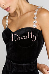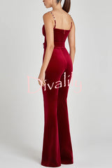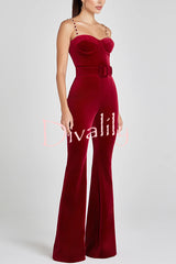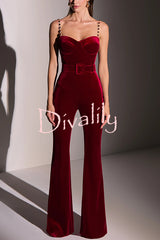 Eliza luxurious velvet fabric jewel-embellished shoulder straps belted flare jumpsuit