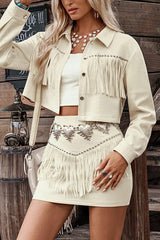 Stylish suede collared long-sleeved cropped jacket and elastic waist casual tassel mini skirt set