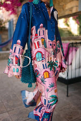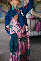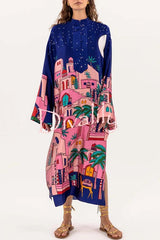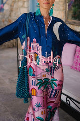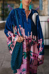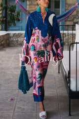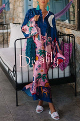 Seaside stroll satin unique print button up long sleeve slit kaftan midi dress