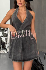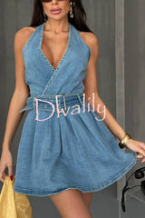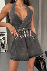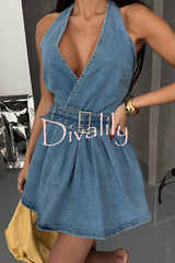 Fashionable halterneck open-back belted denim mini dress
