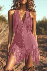 Sexy v-neck sleeveless button-down fringe fitted mini dress