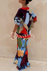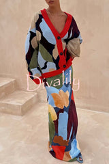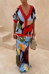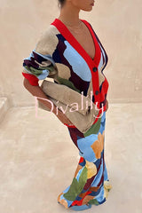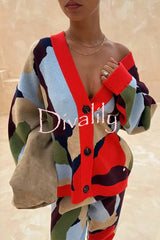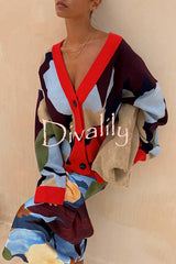 Bright and bold knit abstract color blocks button long sleeve loose cardigan