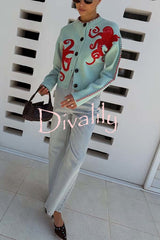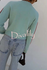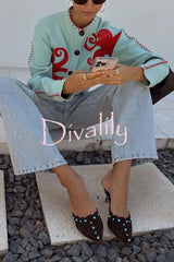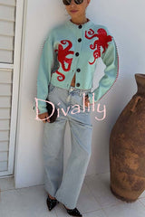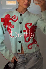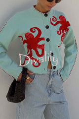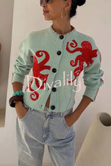 Coastal fashion knit octopus graphic contrast piping button up loose cardigan