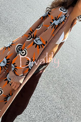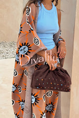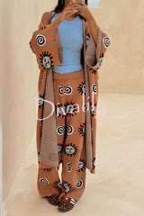• Warm browns and camels contrast with fresh blues and oranges, embracing this season's key trends. We love this print. Slightly oversized, with dropped shoulders and wide sleeves, it's super comfortable and the perfect transition into the cooler months. Inspired by Mediterranean art, it features hand-painted sun and swirl motifs. Pair it with the matching trousers for an effortlessly chic outfit or layer it over yours.