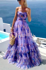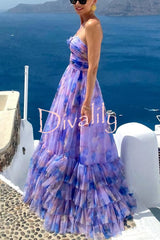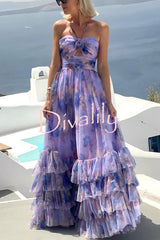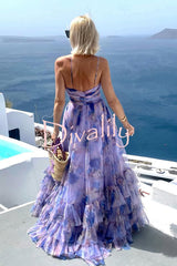 Dreamy clouds tulle printed rose detail cutout ruffles tiered halter maxi dress