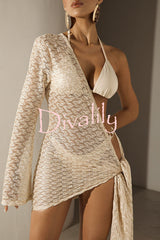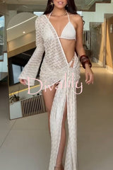 Halter elastic bikini and knit one shoulder bell sleeve tie-up hem cover-up mini dress three piece set