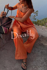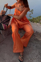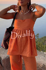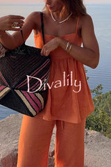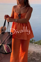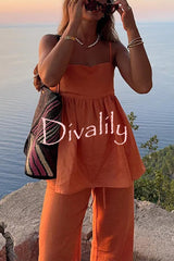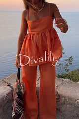 Solid color casual suspender loose top and elastic waist wide leg pants set