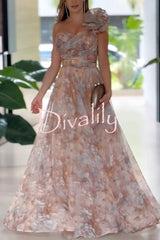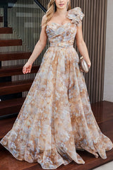 • This ethereal ball gown is perfect for weddings or daytime events. This flowing, long chiffon gown is striking in a romantic floral print accented with earth tones and blues. The elegant one-shoulder design is detailed with deep pleats and features a captivating sweetheart neckline. The A-line skirt ensures graceful movement with every step.Our distinctive clothing will add instant style to your wardrobe .