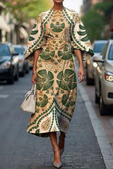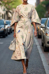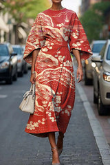 Unique print batwing sleeve waisted casual midi dress