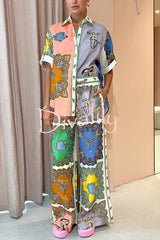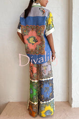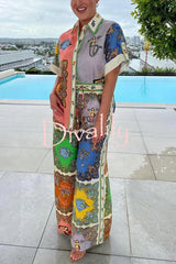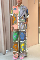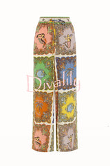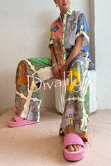 Sunny delights linen blend mermaid print elastic waist pocketed wide leg pants
