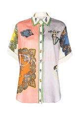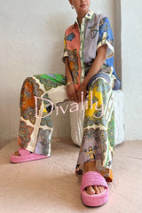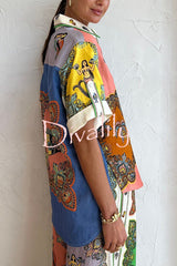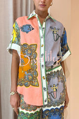 Pretty and posh linen blend mermaid print button down oversized blouse
