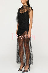 Romantic statement lace one shoulder bell sleeve asymmetrical maxi dress