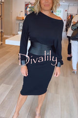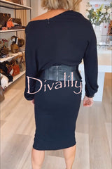Winston faux leather patchwork wide belt design one shoulder stretch midi dress