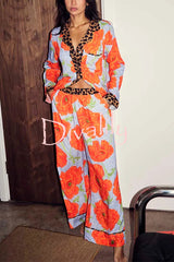 Color-block poppy leopard print trim loose shirt and elastic waist pocketed pajama set