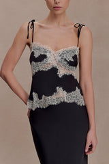 • Crafted from smooth satin fabric and adorned with delicate lace details, the NINA top adds a touch of sophistication to its fluid silhouette. The adjustable tie-back design ensures a comfortable and flattering fit. This elegant and versatile top pairs perfectly with the matching skirt or can be styled with other tailored pieces for a captivating evening look.