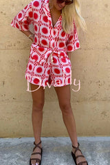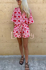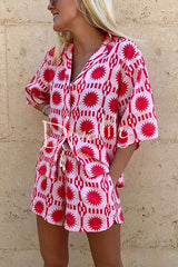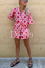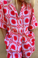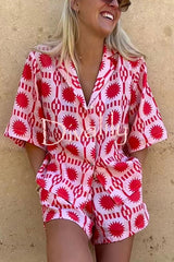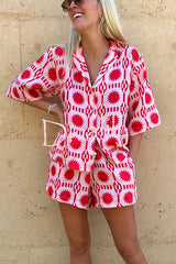 Brighten any day linen blend sun world printed shirt and elastic waist pocketed shorts set