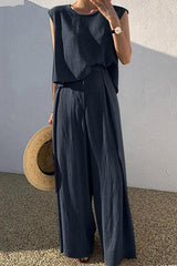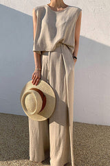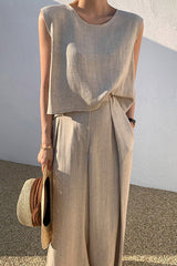 Linen blend casual round neck sleeveless top and loose wide-leg pants set